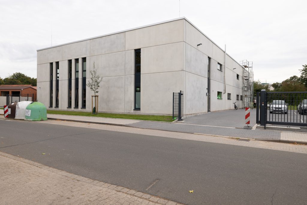 Das zweigeschossige Gebäude wird in Massivbauweise aus Stahlbeton-Fertigteilen errichtet, einschließlich der Hüllflächen aus Stahlbeton-Fertigteil-Sandwichwandplatten. Das Flachdach besteht aus Stahltrapezprofilblechen mit PVC-Dachdichtungsbahnen und Mineralfaserdämmung.