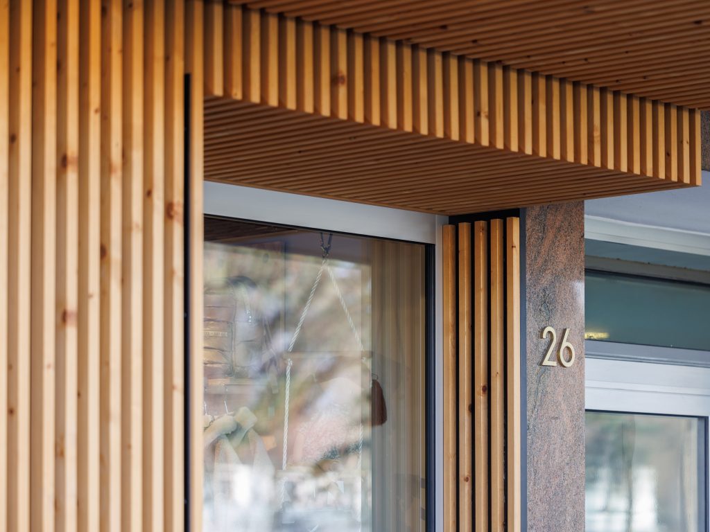 Die Fassadenverkleidung und der Überbau sind durch vertikal angeordnete Lamellen auf schwarzer Grundplatte geprägt. Diese klare, rhythmische Struktur verleiht dem Gebäude eine markante, zeitgemäße Erscheinung und unterstreicht die gestalterische Verbindung zwischen Innen- und Außenraum.
